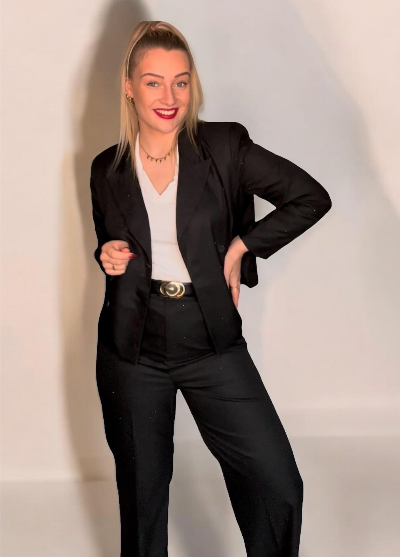 Het Rianne Rhinestone Pak is prachtig mooi en voor onze plus size girlies die langer zijn. Zowel het jasje als de broek hebben allemaal steentjes. Het Pak is zwart met rhinestones er op. Wij raden je aan als je tussen 2 maten in zit eerder een maat groter dan kleiner te nemen.