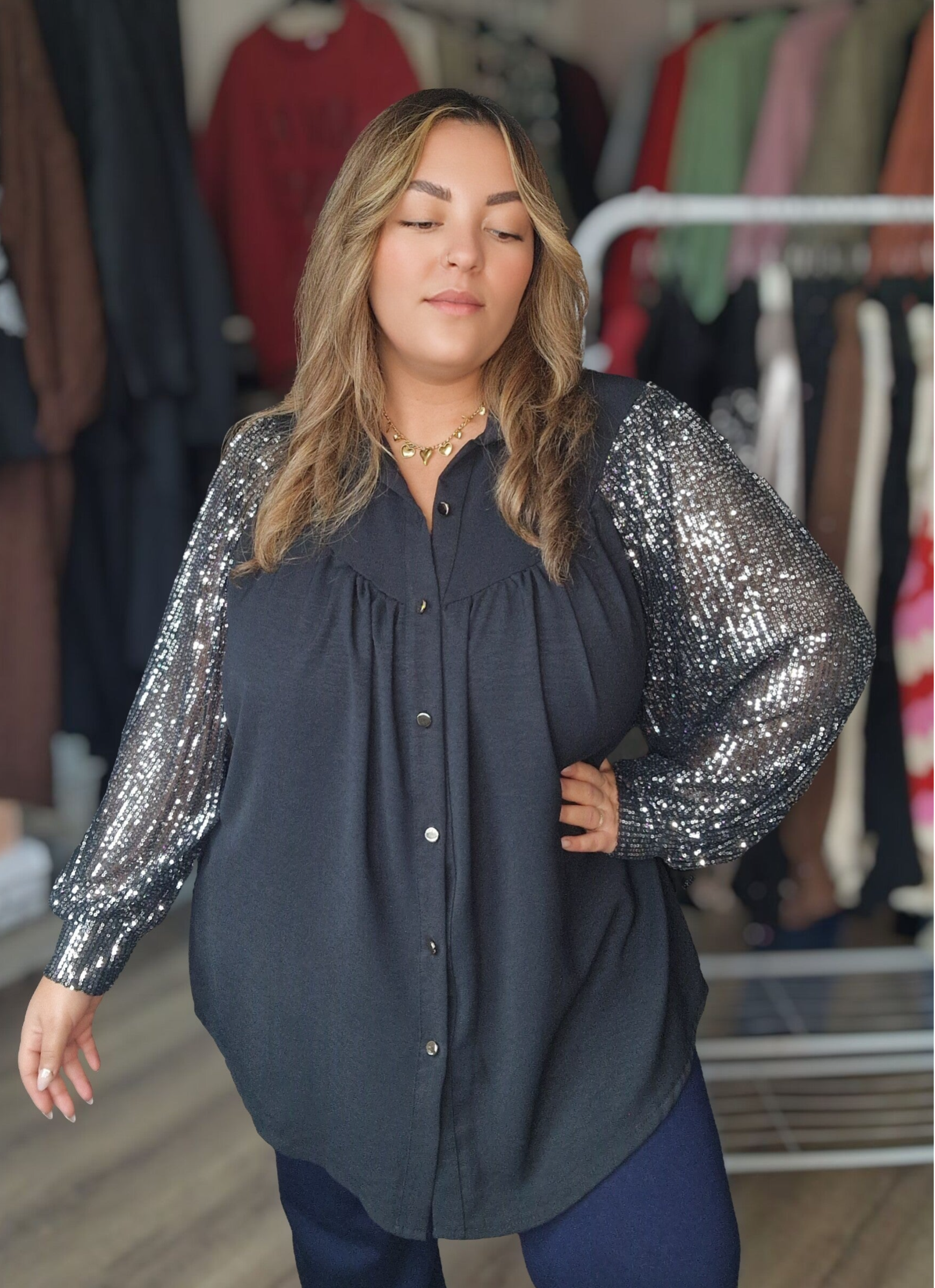 Deze prachtige blouse met glitter mouwen is niet alleen heel mooi maar zit ook ontzettend fijn. De mouwen zijn gemaakt van pailetten. De mouwen schijnen door waardoor je een super mooi sexy maar classy effect krijgt. De blouse is mooi lang.