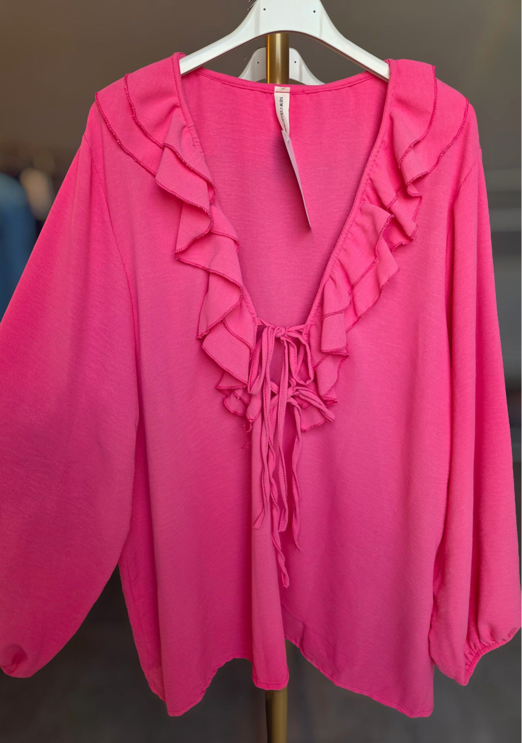 Onze prachtige Feline blouse heeft prachtige ruffels en kun je boven aan knopen. Tussen de knopen in zie je je huid ontzettend mooi. In de mouwen zitten rek!