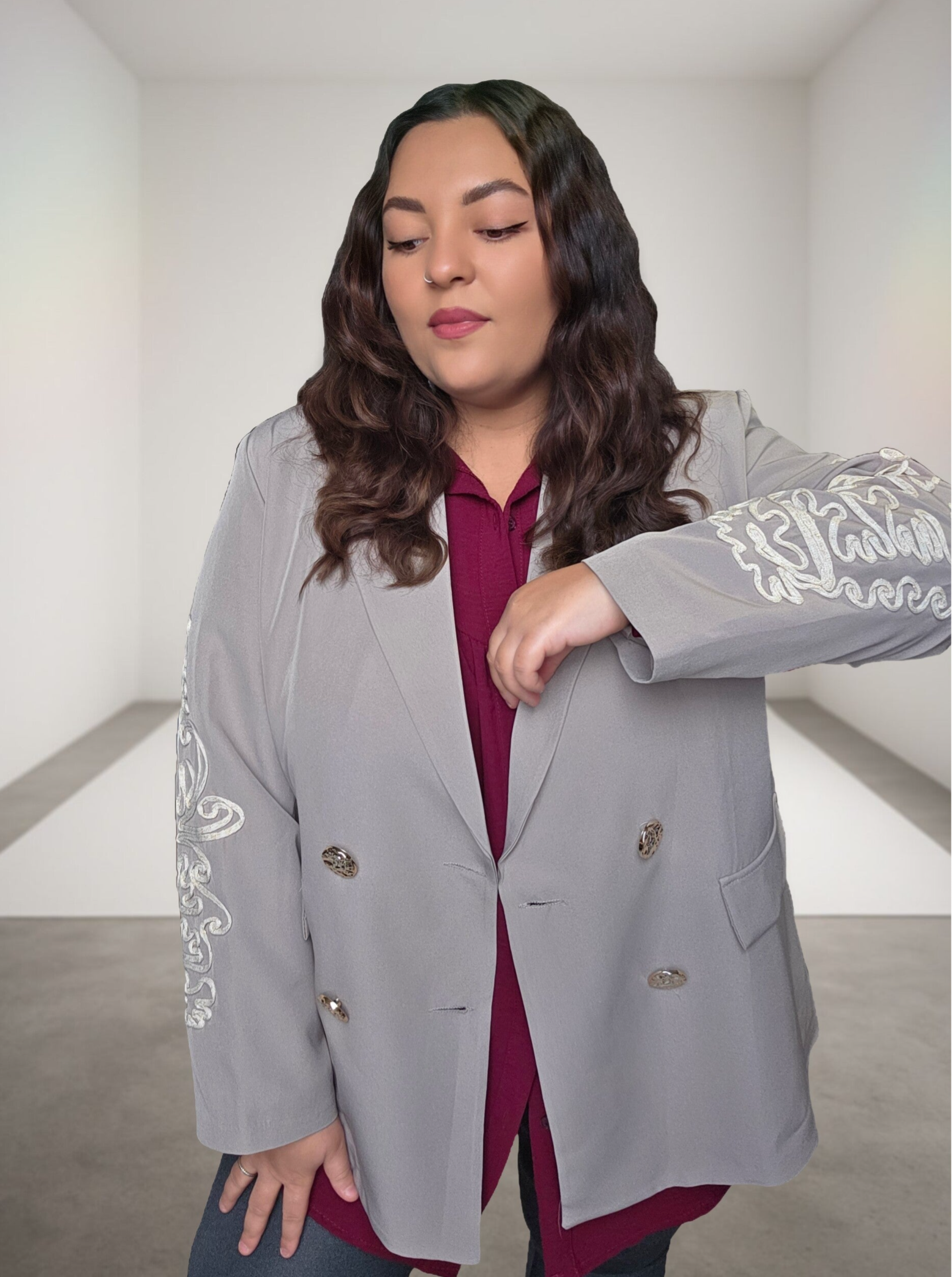 Onze prachtige sienna blazer heeft hele gave details op de mouwen en mooie grote gouden knopen te dragen vanaf een maat xl tot maat 48!